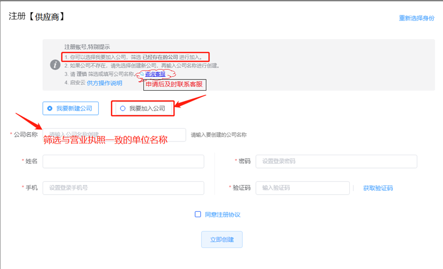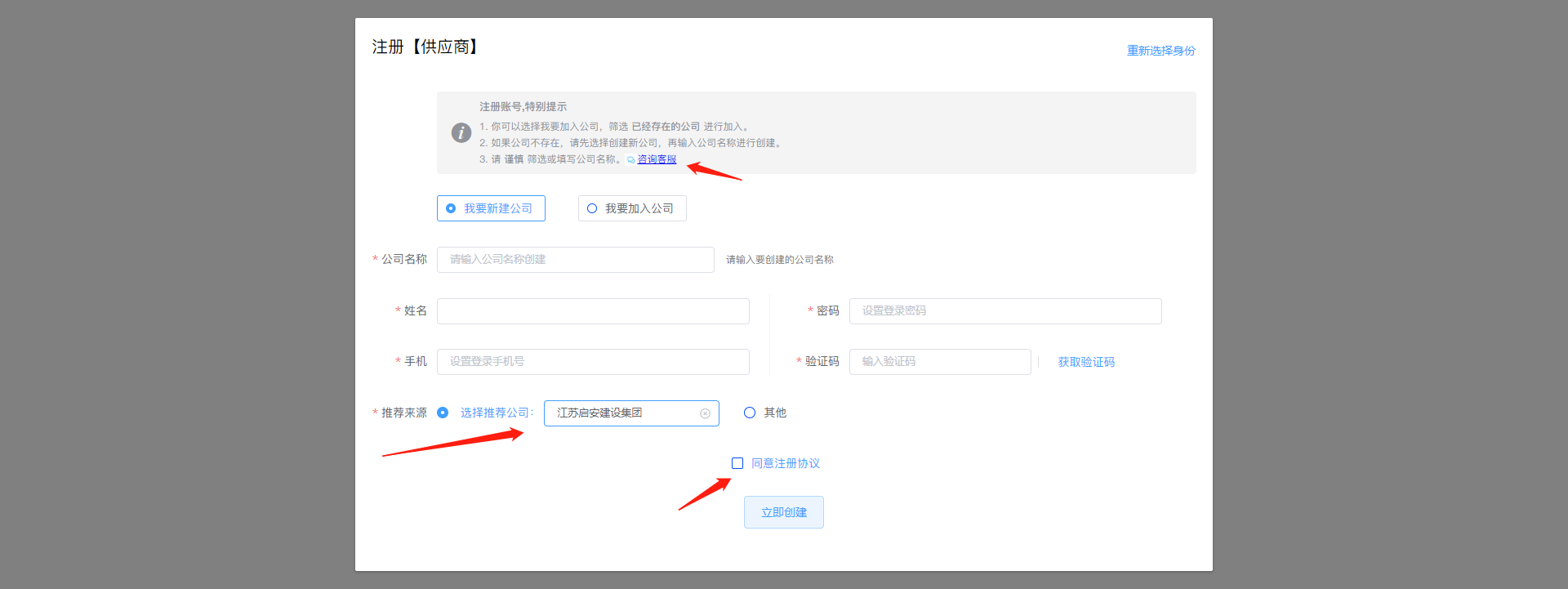 第二種情況:是供應(yīng)商企業(yè)沒有在平臺(tái)注冊(cè)過,點(diǎn)我要新建公司,按步驟順序填寫完整(邀請(qǐng)企業(yè)選江蘇啟安建設(shè)集團(tuán))。