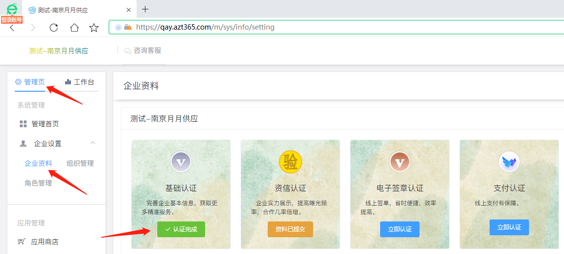 在管理頁中點(diǎn)擊企業(yè)資料填寫完整基礎(chǔ)認(rèn)證就可以了。